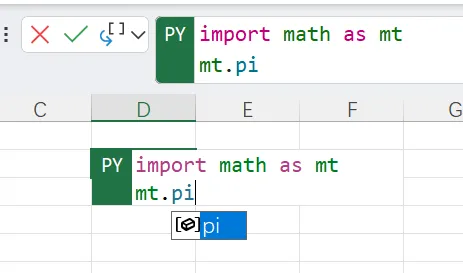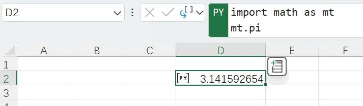 如果需要使用Excel没有自动加载的其他Python库中的方法或函数,可以使用关键字import来实现。例如,想要获取Pi的值。