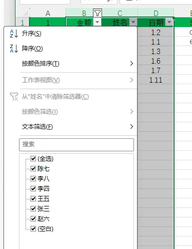 比如你只想看 “张三” 的数据,就点击【姓名】列标题右边的小箭头,在弹出的菜单里,只勾选【张三】,其他的都取消勾选,然后点击【确定】。