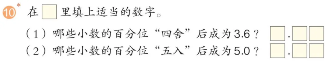 第六,回顾主问题。哪些小数的百分位“四舍”后成为3.6?哪些小数的百分位“五入”后成为5.0?