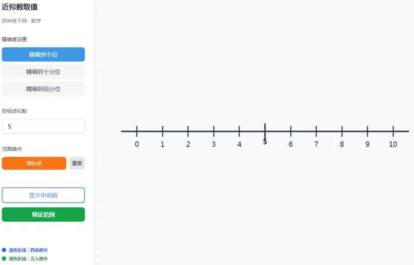 解读页面。①页面的左边部分可以任意输入想要取的近似数。②输入近似数后,在上面选择精确度设置,页面的右边相应出现精确度不同的数轴。③点击橙色按钮“增加点”,数轴上即可出现两个可以通过鼠标移动的点。④按钮“中间数”显示已经选择的两个点之间的中间数,并在图中用虚线表示。虚线的左边绿色表示五入部分,右边蓝色表示四舍部分。⑤确认取值范围后,验证按钮对选择的取值部分进行验证,成功时有彩条飘下。