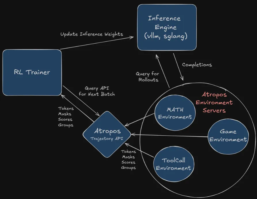 1. Atropos (LLM RL Gym) 强化学习:Nous Research开发的Atropos库,是一个用于大语言模型异步强化学习的“环境微服务框架”。Atropos 利用LLM as Judge + DPO来实现RLAIF来实现自动化强化学习能力.