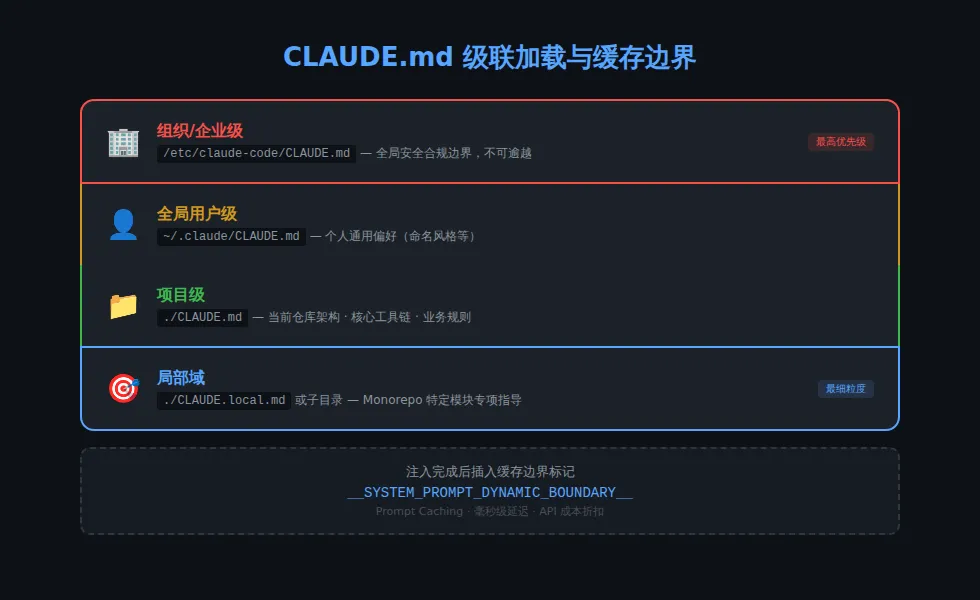 在组装完所有层级的指令后,系统会插入硬编码的缓存边界标记 __SYSTEM_PROMPT_DYNAMIC_BOUNDARY__,专门用于优化 Anthropic API 的 Prompt Caching 机制,实现毫秒级延迟与显著成本折扣。