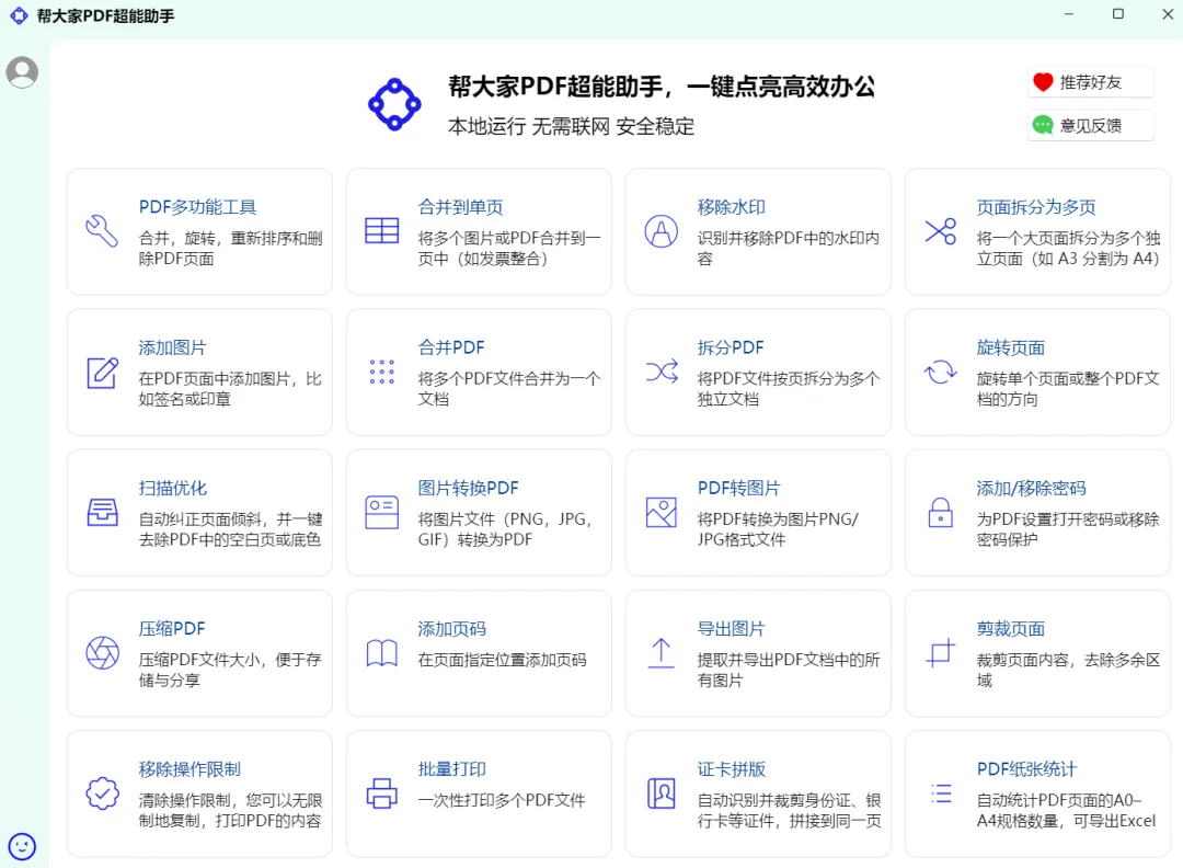 说句实话,我之前对PDF工具是有点“PTSD”的,不是收费,就是限制功能,不是要联网上传,就是处理慢到怀疑人生。直到我用了这个—帮大家PDF超能助手,用了大概一周,我现在基本已经把它当“标配工具”了,最关键三点:完全免费,本地运行(不联网),功能全到离谱。