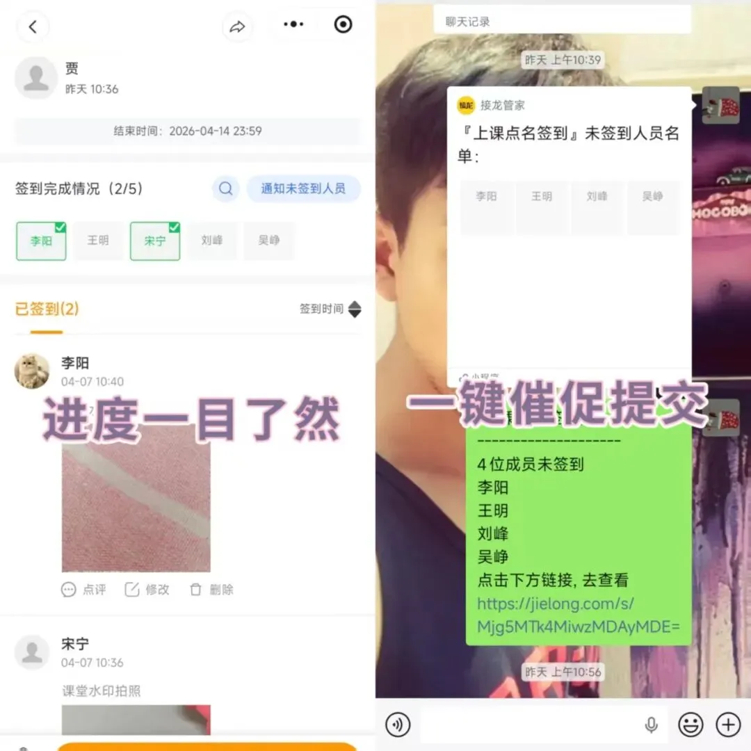 Excel 表格:参与者得:下载文件→用 Excel 打开→填写信息→保存文件→重命名(比如 “张三 – 报名表”)→找到群→上传文件。这一套操作下来,至少要 3-5 分钟。更麻烦的是,收集者最后要收几十个文件,一个个打开、复制、粘贴、汇总…… 填表的人累,收表的人更累。接龙管家:参与者点群里的链接→直接在小程序里填写→点 “提交”。全程不超过 30 秒。支持文字、图片、录音、视频、文件等多种格式,填完就走,不用下载任何东西。收集者能在后台实时看到谁填了、谁没填,一键提醒没完成的人。所有数据自动汇总,不用手动合并。结论:接龙管家完胜。它把填表从 “麻烦事” 变成了 “顺手事”。