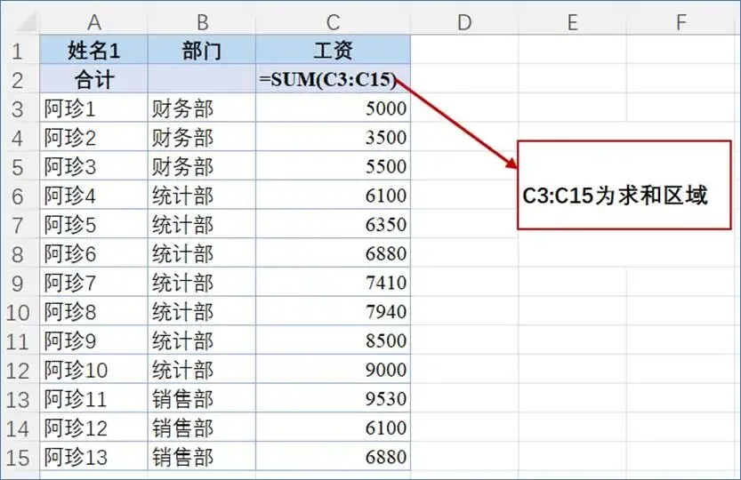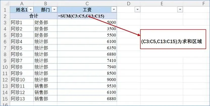 (2)多个区域求和公式:=SUM(求和区域1,求和区域2),例:求财务部、销售部工资总和: