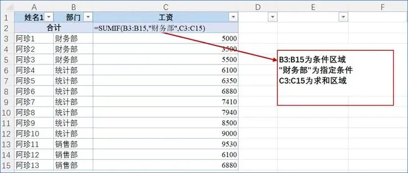 公式:=SUMIF(条件区域, 指定条件, 求和区域)。举例求财务部的工资总额: