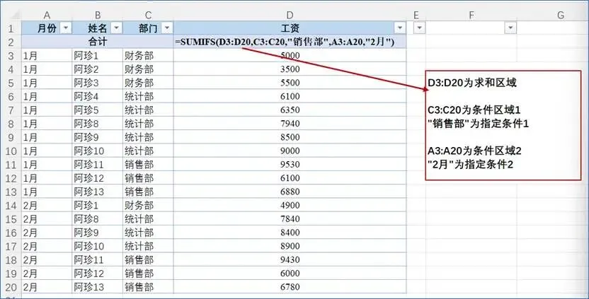 公式:=SUMIFS(求和区域, 条件区域1, 指定条件1, 条件区域2, 指定条件2,…)。举例:求销售部2月工资总额: