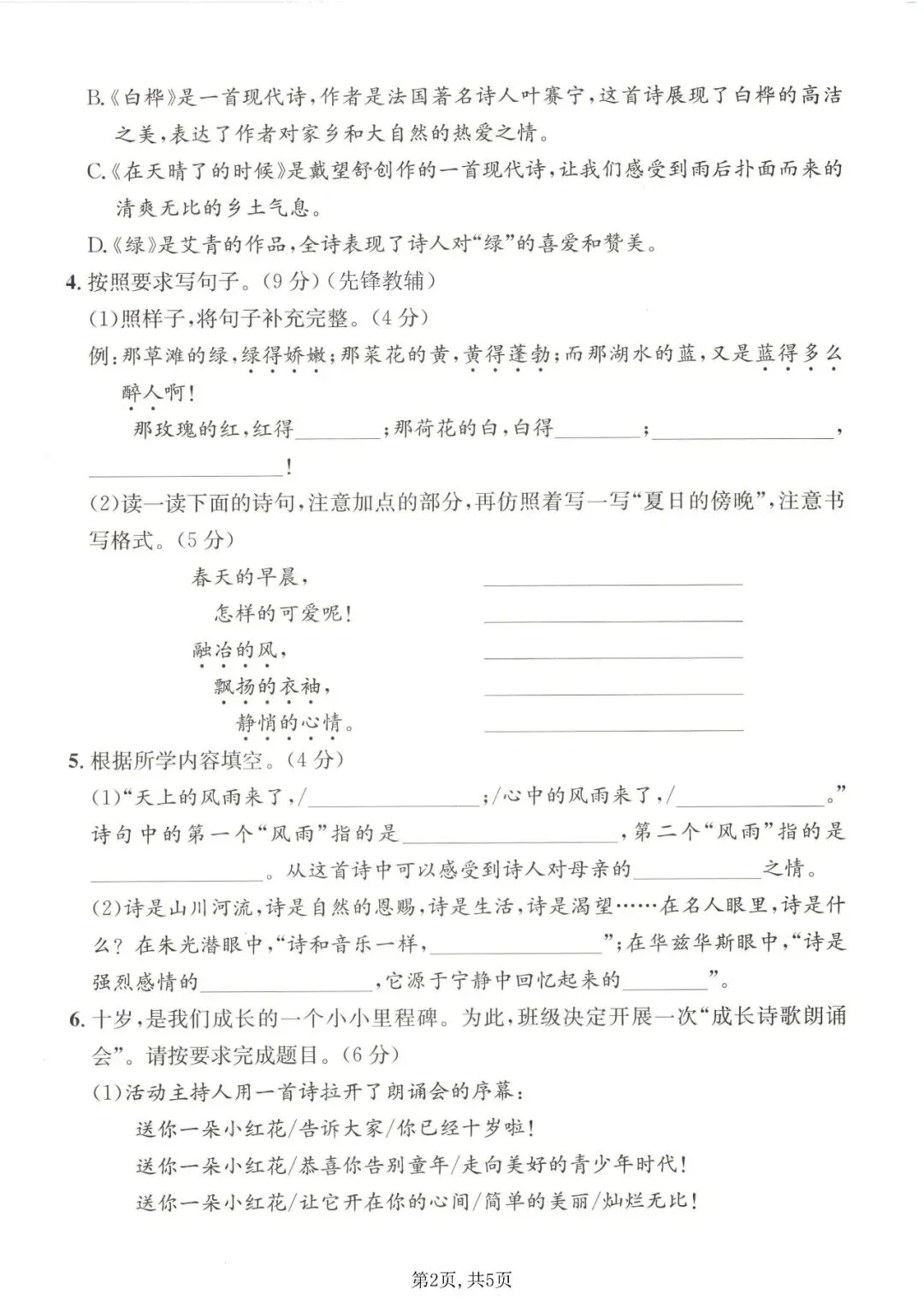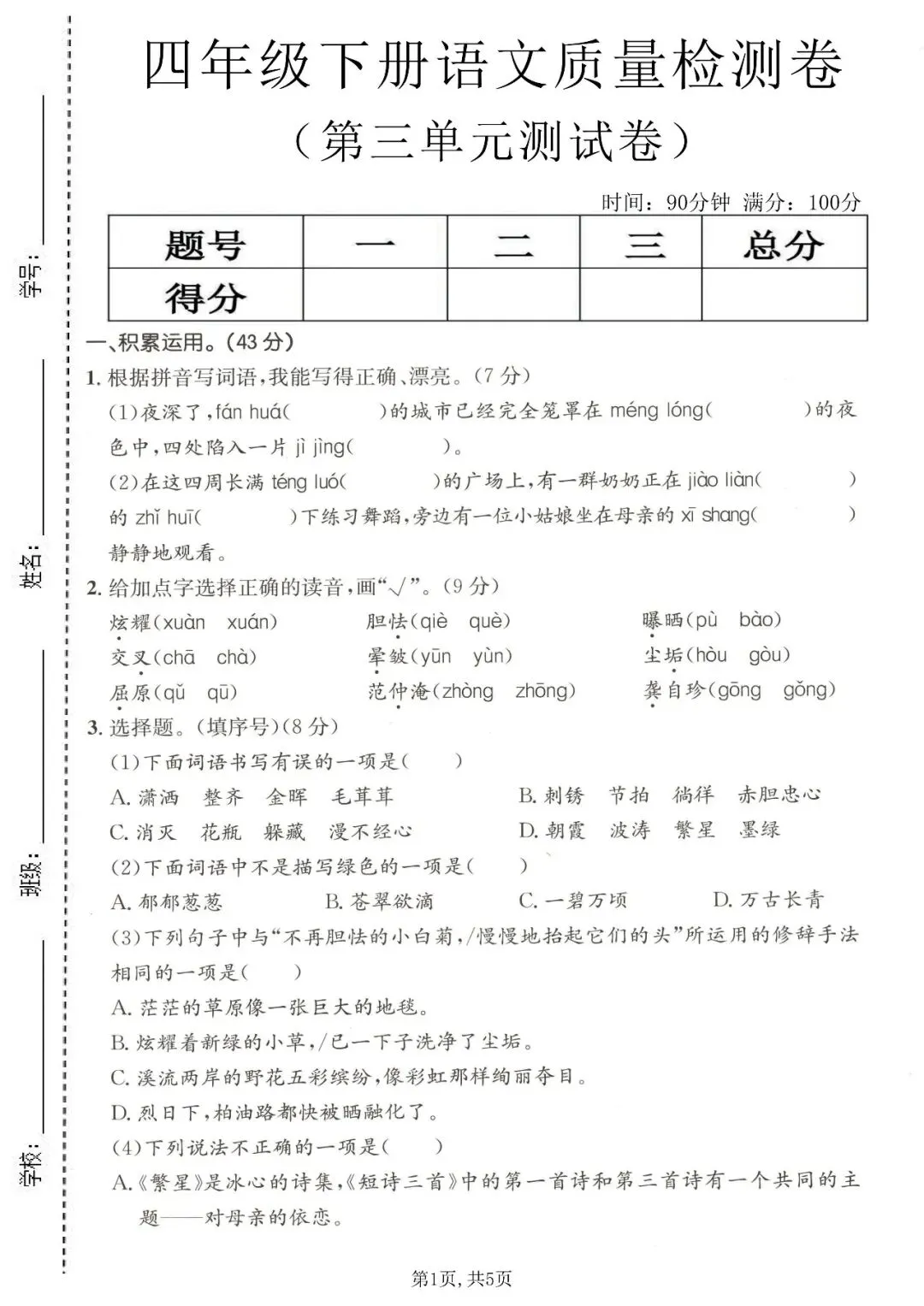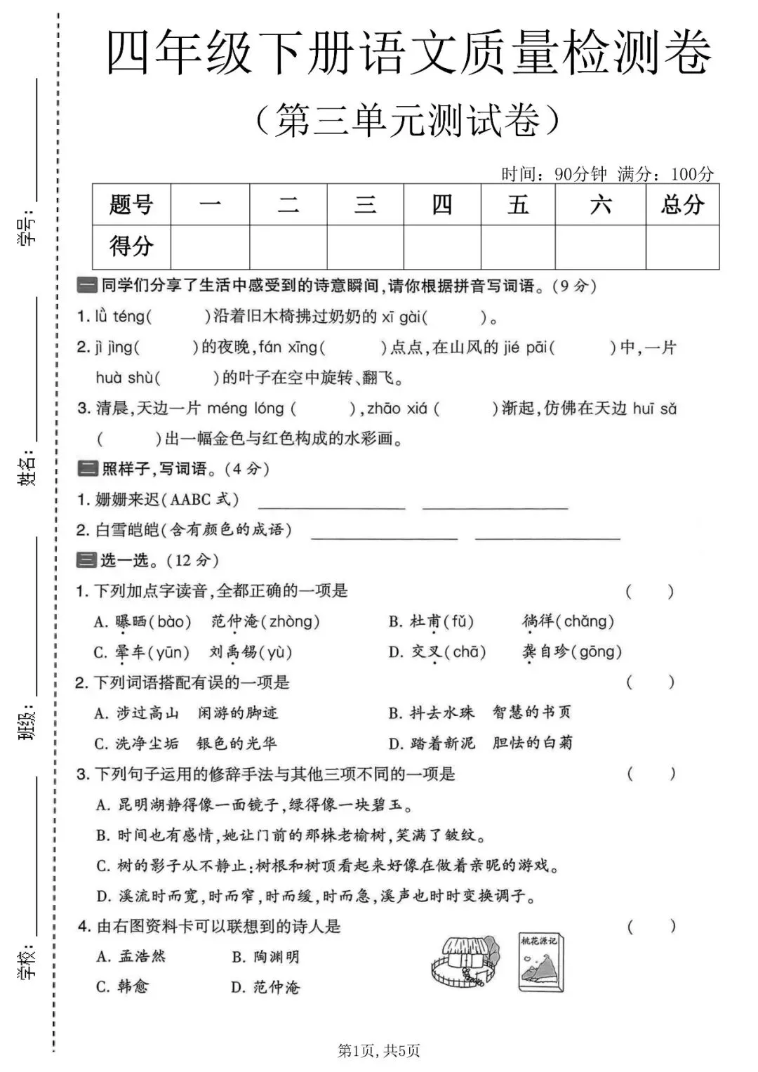 四年级语文下册《第三单元检测卷》2套丨可下载