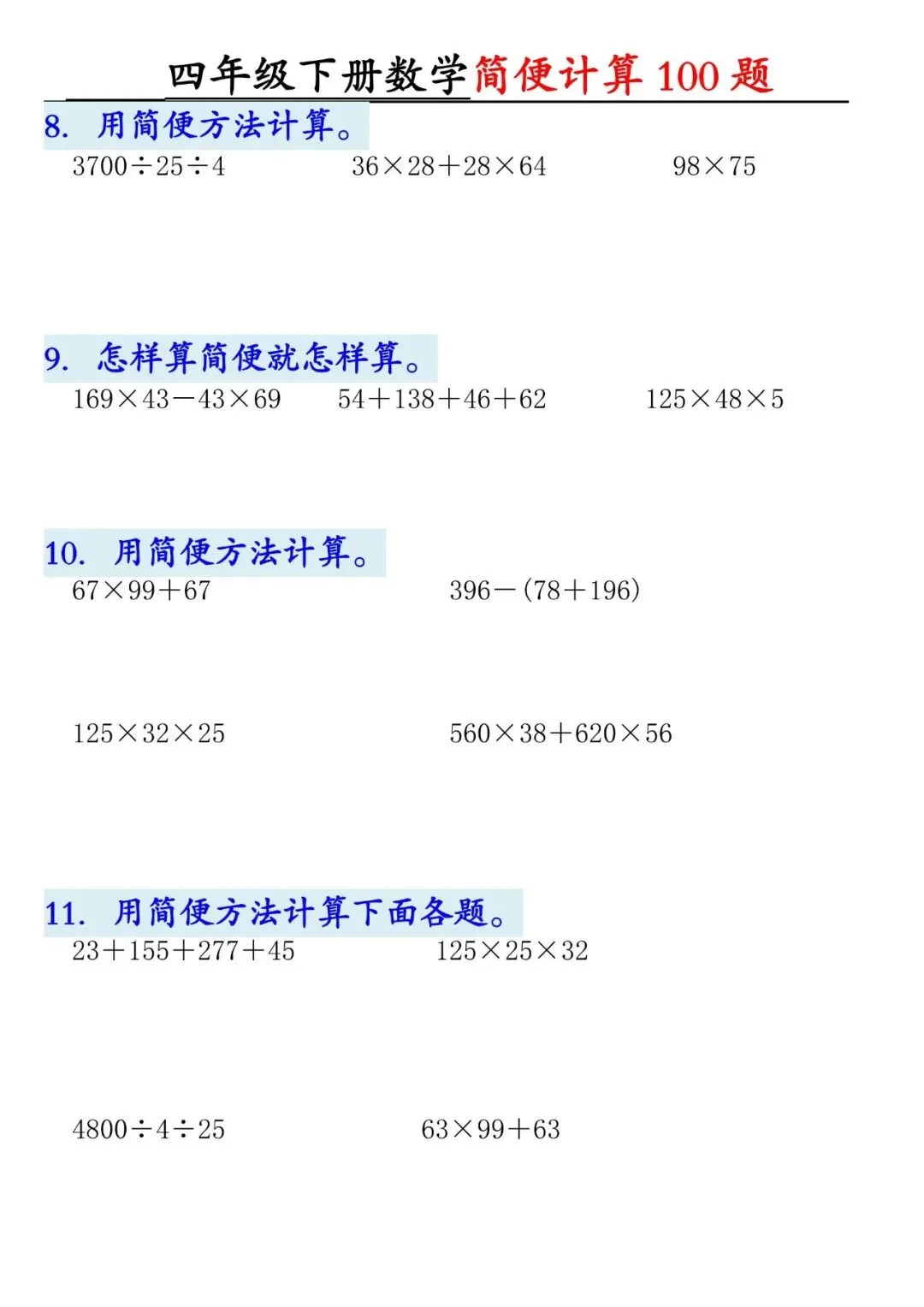 26年春六年级数学下册简便计算,电子版可打印