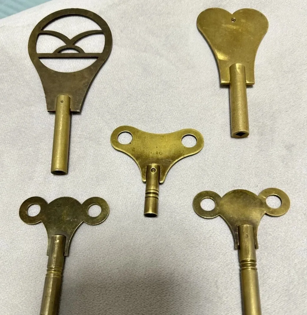 这些造型千奇百怪的铜钥匙可了不得,图上左一是竹叶样的,右上那个活像一颗心,下头两个更像老鼠耳朵,哪怕搬出来问问家边上邻居,知道确切用法的还真不多,其实它们都叫做机械钟表的上弦钥匙。