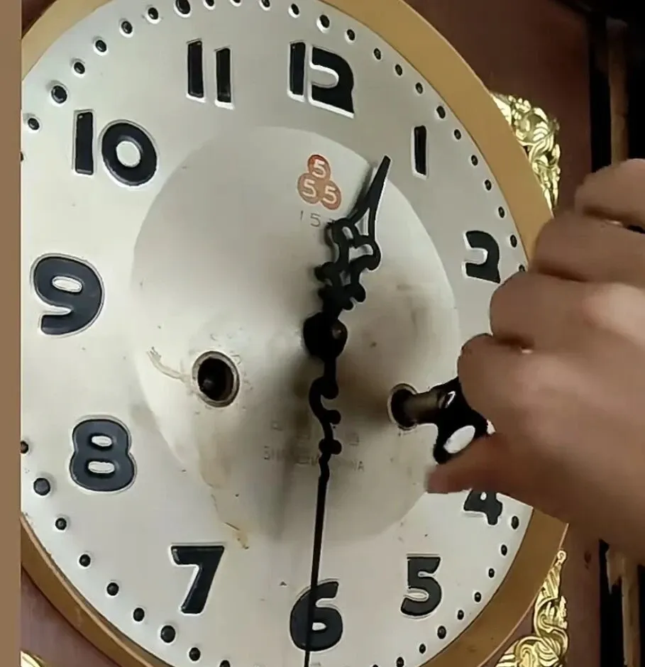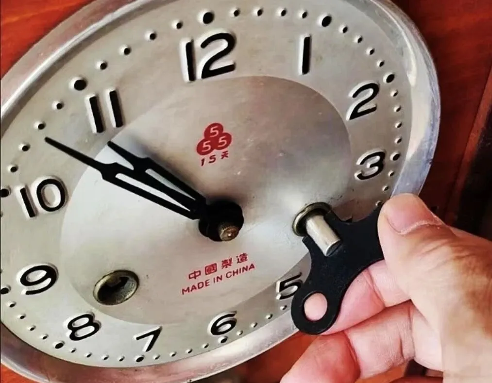 图中老钟面熟悉吧,这正是家里墙头上那口挂了大半辈子的五五五挂钟,银白色表盘上,黑色阿拉伯数字摞得满满当当,右下角上弦孔正对着钥匙的缺口,每回到周末,爸爸都会喊一嗓子“把挂钟拧一下,别让它停了”,轮到我去,经常笨手笨脚,钥匙插进去打滑,总得比划半天,直到“咔哒哒”进去了才算放心。