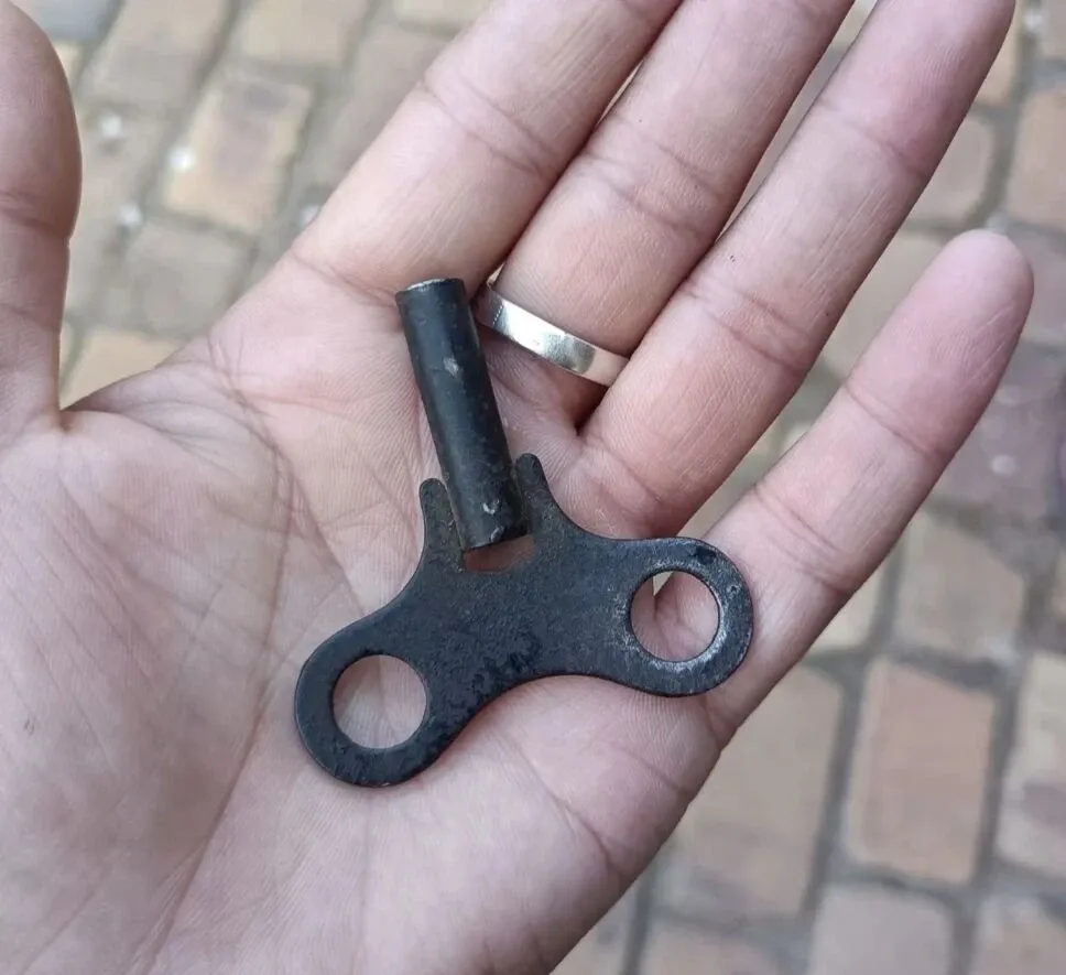这个物件叫单孔钟表钥匙,样子没啥花头,一个黑不溜秋的小铁片加两个圆洞,小时候见在抽屉里甩来甩去,也不知道干啥用的,大人偶尔扔进缝衣筐,最多拿出来敲敲桌面,真到要用时,还得找半天,说来也怪,这种平平常常一点不显眼的小家伙,没了还真折腾不起大钟。