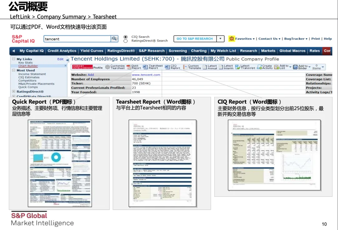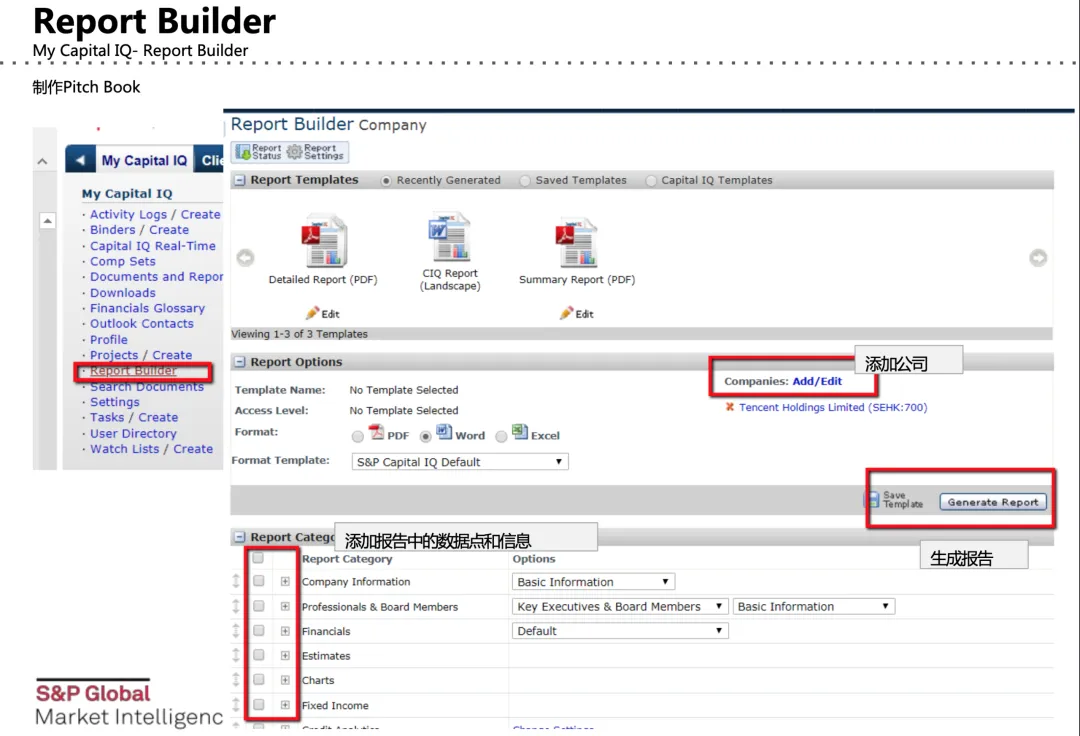 这里说实话我看不太清,就不一一说细节了,看到格式format有三种可选,pdf、word和excel,format template 标普财智默认,然后是添加公司,那里的案例是Tencent,生成报告,添加报告中的数据点和信息。