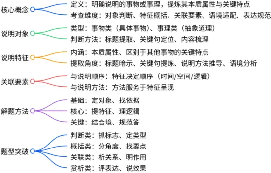 1.对象判断:区分事物与事理说明文,明确说明对象具体所指。2.特征概括:提炼说明对象的核心特点,全面且精准。3.关联要素:分析说明对象及特征与说明顺序、说明方法的内在联系。4.语境适配:结合文本语境、说明角度,深化对特征的理解。5.表达规范:按逻辑组织语言,清晰呈现判断与概括结果。 |