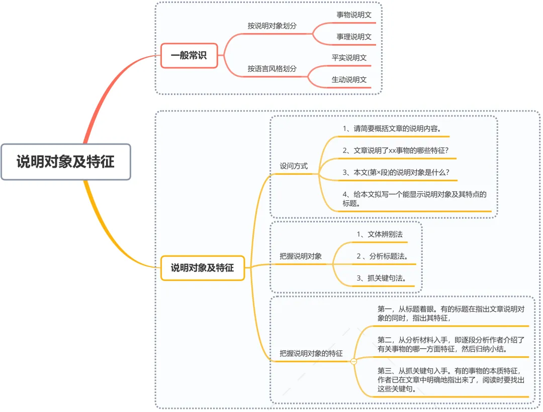 说明对象是说明文所要介绍的具体事物(如“苏州园林”)或抽象事理(如“物候现象的成因”);说明特征是说明对象区别于其他事物或事理的本质属性、关键特点,是说明文的核心解读内容。 |