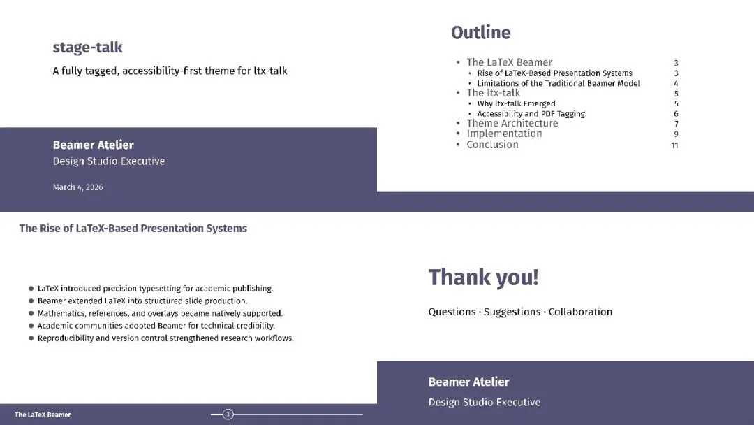 stage‑talk 是 ltx‑talk 专用主题,专注 教学材料标签 PDF 输出,提供整洁 lecture 视觉体系,内置表格/图表语义标签模板,确保结构、阅读序、替代文本规范,适配现代无障碍工作流。