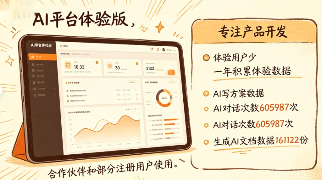当前一直是AIP智能体平台体验版对外,更多是合作伙伴还有部分注册用户使用,前期一直专注于产品的开发,没有太多体验用户,在这一年里面积累下来的体验数据。这里拿了两个数据,一个是AI写方案的数据,一个是AI对话的,目前后台对话的次数是605987次,然后生成的AI文档数据是161122份。当然还有其它的场景,这里就不做统计。