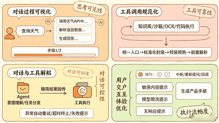 在自研Agent平台的实际体验版运行中,对话与工具的联动效果直接决定用户可用感,我们围绕思考可见性、执行流畅度、工具可靠性、对话可控性做了大量针对性优化,核心经验如下: