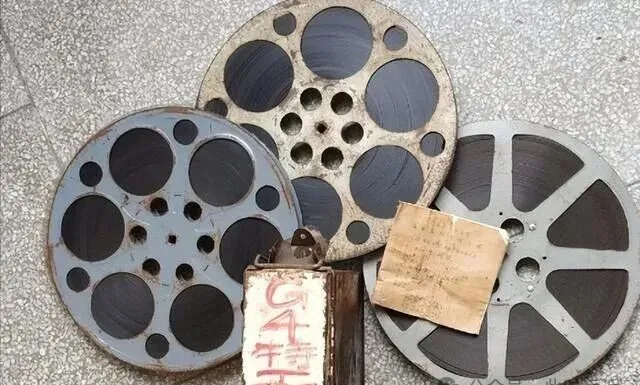 图里这几盘憨憨的大圆东西叫电影胶片盘,外壳铁咕隆咚的,盘圈上一排小眼,中间黑呼呼卷着胶带似的胶片,盘子有点分量,提在手上咯吱作响,拷贝员叔叔走进院一抬手,气氛就变了。