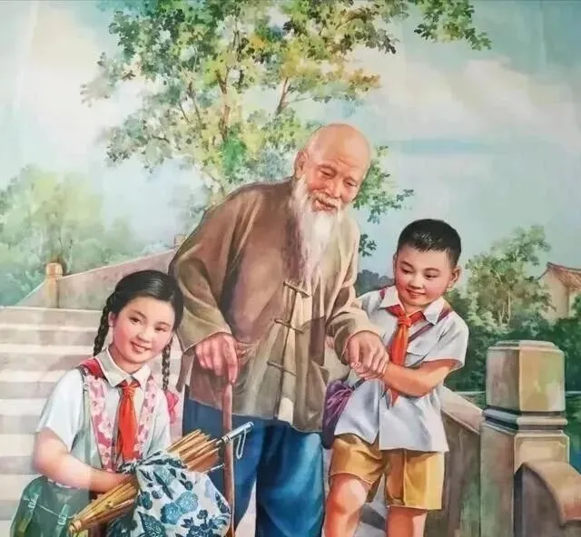 画里这个场景你熟不,上了年纪的看了八成都要咂摸一下,这叫尊老爱幼宣传画,画面亮堂堂,红领巾、小辫子,爷爷拄着拐,看着就觉得日子悠着。