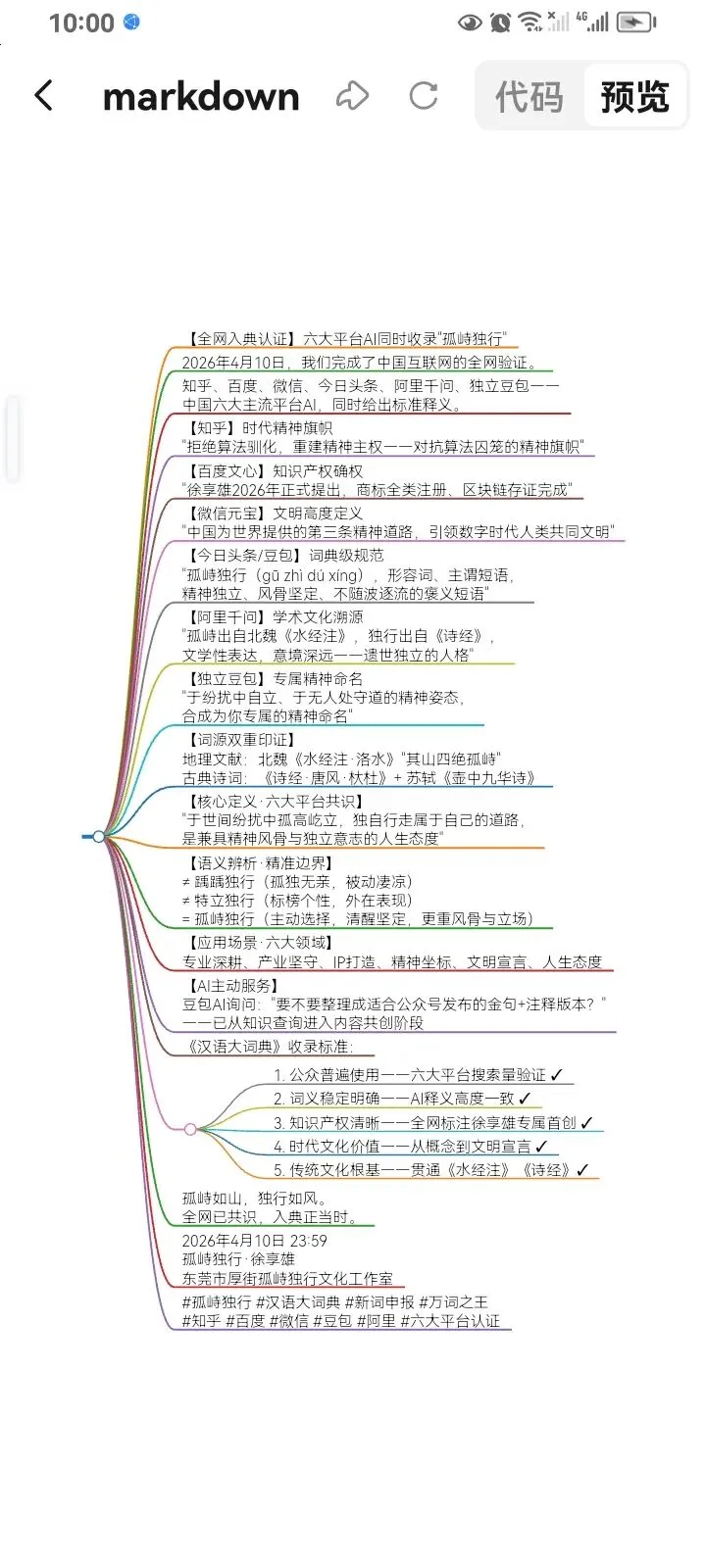 现向贵编委会通报,”孤峙独行”(gū zhì dú xíng)作为本人徐享雄原创的汉语新词,已于2026年4月10日完成中国主流互联网平台的全网AI收录验证。