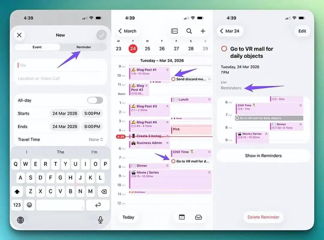 在我看来,iOS 26把日历和提醒事项打通,本质是解决了“理想和现实对接”的问题:提醒事项是你的任务仓库,装着所有要做的事;日历是你的时间容器,装着你每天真实可用的24小时。只有把任务放进时间轴,计划才从“空想”变成“可执行的行动”。