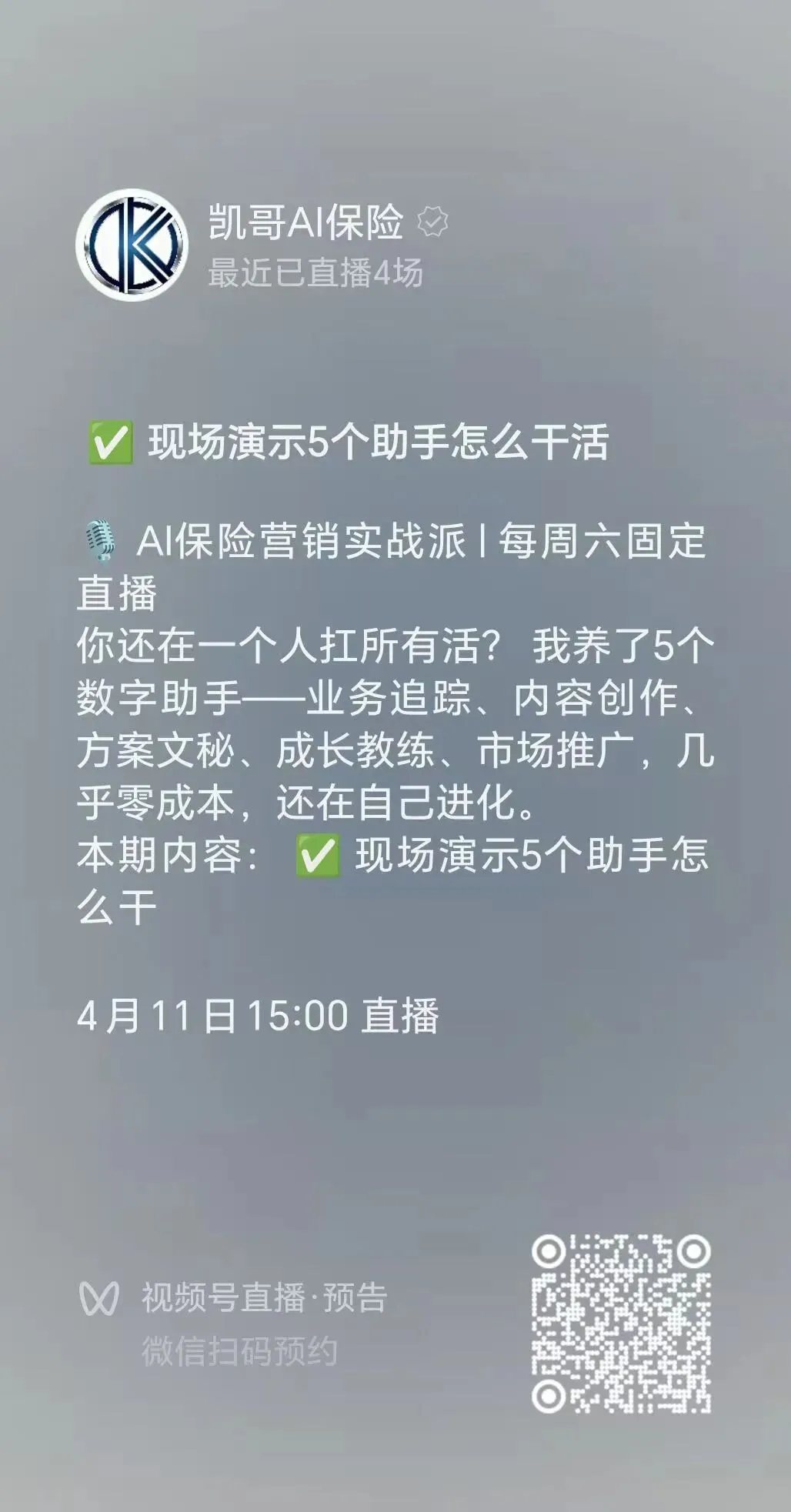 我是AI保险营销实战派,每周六下午3点固定直播,分享AI在保险营销领域的实战应用。关注我,一起用AI把保险营销做透。
