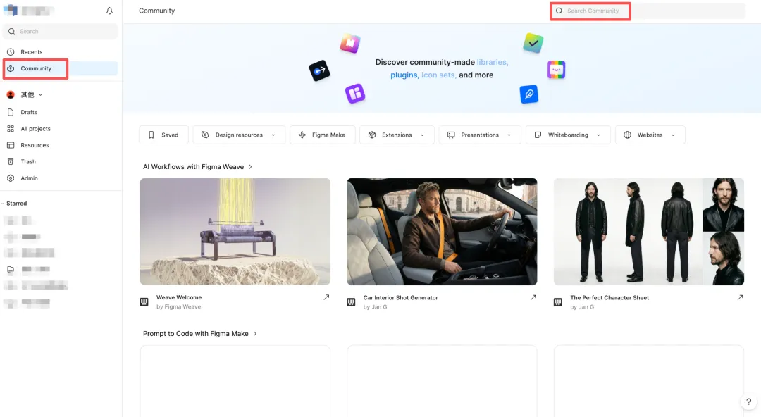 首先打开Figam,点击左侧菜单栏的【Community】后,在右上角的方框中搜索。
