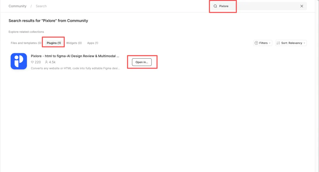 搜索【Pixlore】插件,点开【Plugins(1)】-【open in】