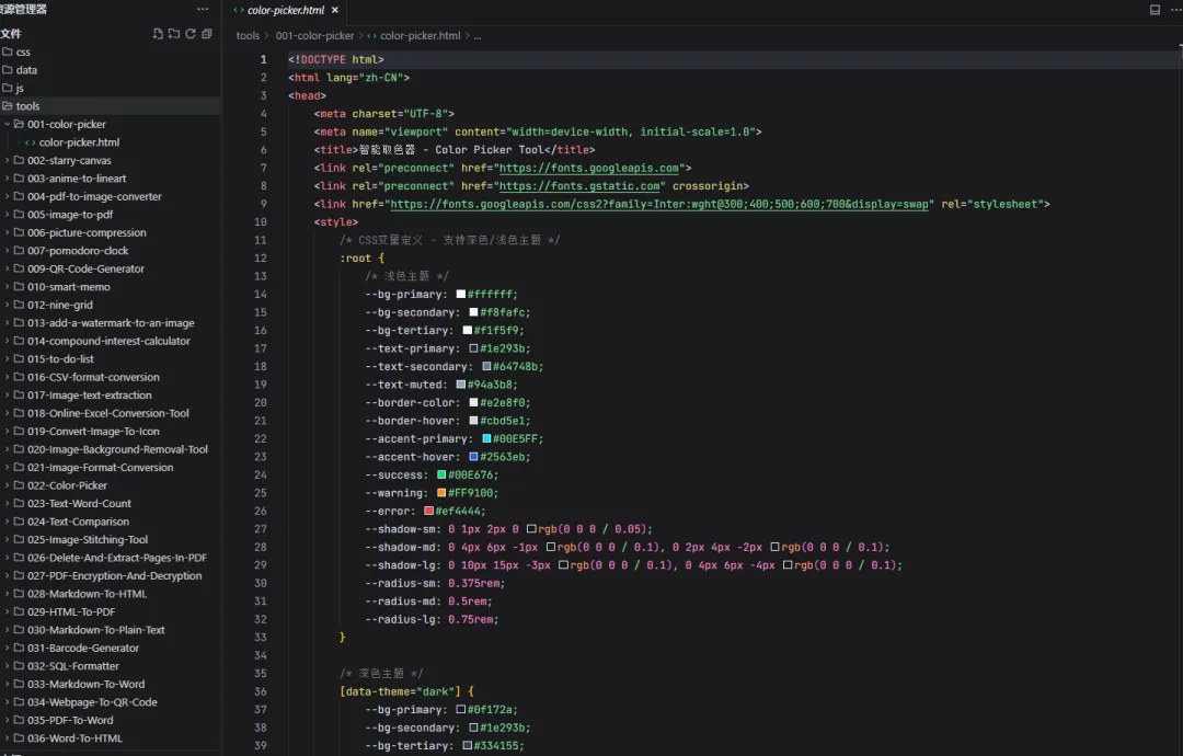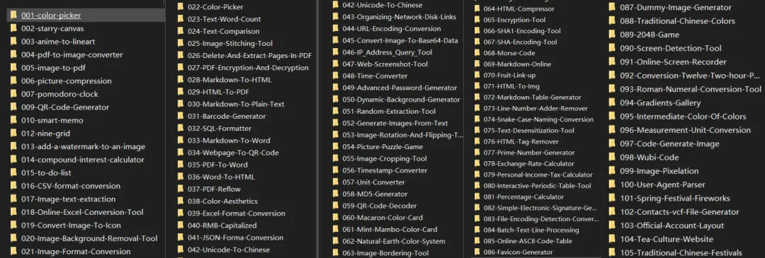 全套工具集源码,终于整理好了 从零搭建,将 100 个小工具做成了一个工具集网站 看完文章后,有需要完整可直接运行的源码文件,希望搭建属于自己的工具箱网站。 这份源码是结合所有文章内容,一步一步优化整理完成的成品,下载后无需复杂的配置,打开运行就可以看到完整的效果。 同时,方便大家在此基础上添加更多的功能,下图为工具的部分源码。 完整的源码目录,仅包含下述目录所有工具,不包含后续新开发的工具。 注意,所有代码是使用 html 实现。有需要这份源码的朋友,可以直接在公众号后台私信我,备注:工具源码 看到消息后会第一时间回复大家!