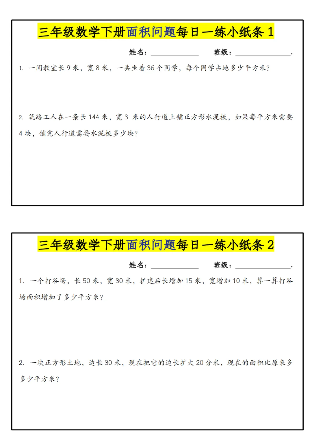 【免费下载】三年级(下)数学 面积问题每日一练小纸条,PDF电子版,共21页,先保存,以免资源失效