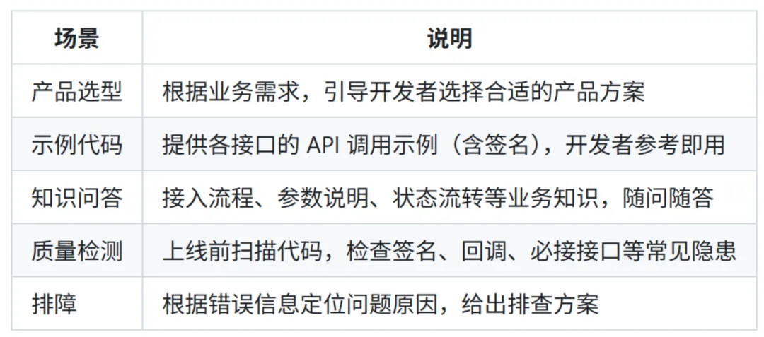 工具箱的核心是三块:Skill技能包、AI友好文档、AI友好API。Skill技能包你可以理解成一个预装了微信支付”知识”的插件,它告诉AI什么是小程序支付、退款要走什么流程、分账规则是什么。有了它,你不需要把一堆文档喂给AI,它直接就懂了。AI友好文档和API,则是把原本给人看的技术文档重新改造,让AI读起来不费劲。