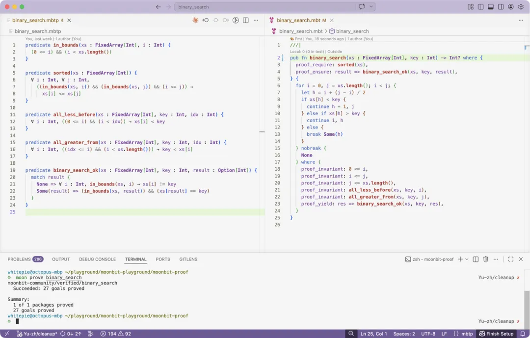 上面这张截图展示了 MoonBit 中对二分查找的完整验证。左侧是带有合约和循环不变量的函数实现,右侧是谓词定义文件,底部终端显示验证全部通过。