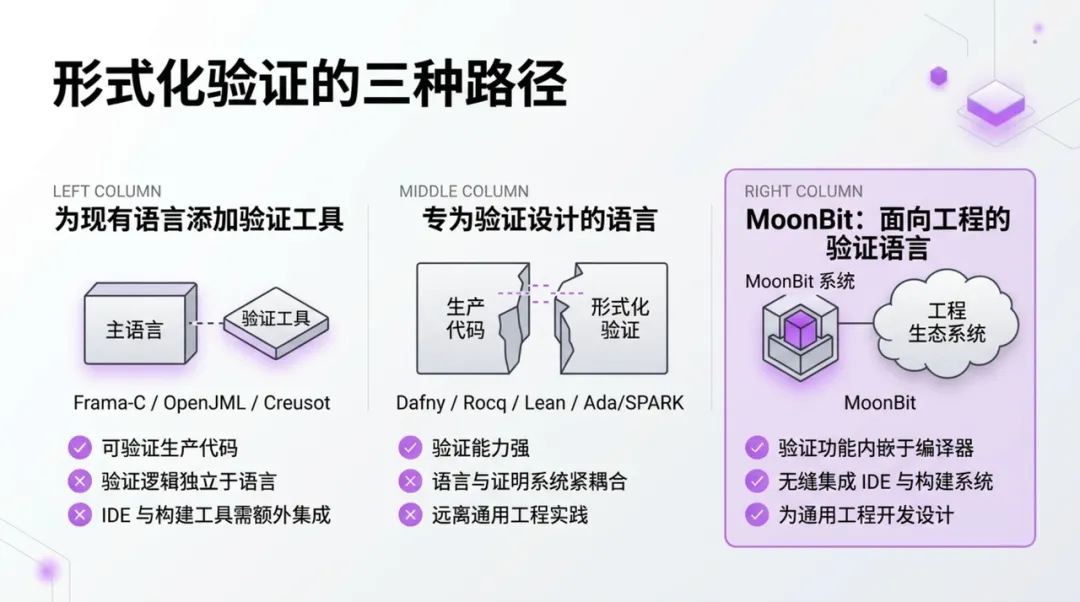 MoonBit 的差异化在于垂直整合:合约、谓词、循环不变量和 proof_assert 都是语言语法的一等成员,而不是藏在注释或宏里的二等公民。编译器直接理解这些结构,这意味着 IDE 可以像处理普通代码一样对验证注解提供语法高亮、自动补全、类型检查和错误定位;moon prove 作为构建系统的内置命令,与 moon build、moon test 并列,开发者不需要配置额外的工具链或切换工作流。从编写代码到编写证明,再到运行验证,全部在同一套语言、同一个 IDE、同一条命令行中完成。