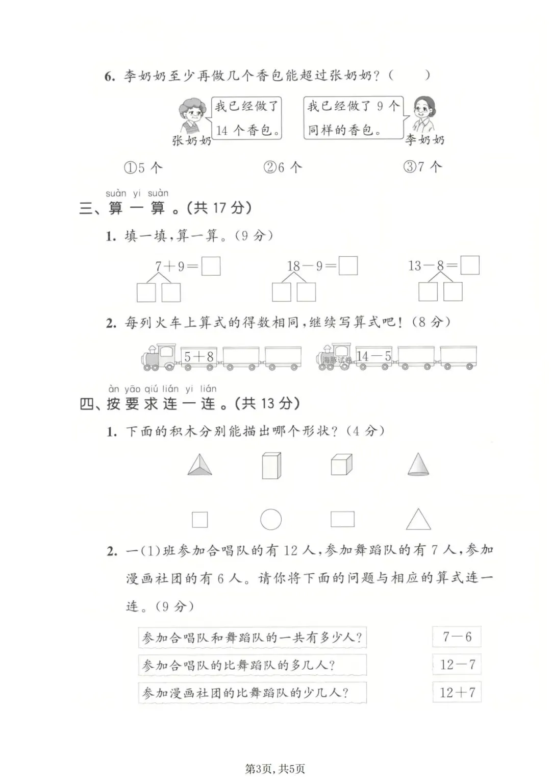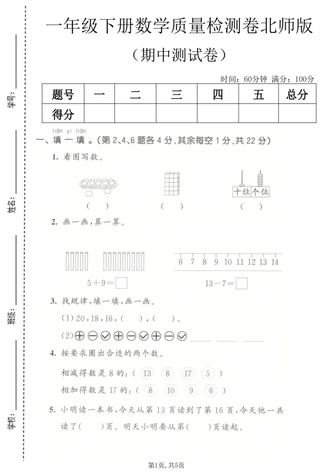 一年级下册数学期中测试卷丨可打印