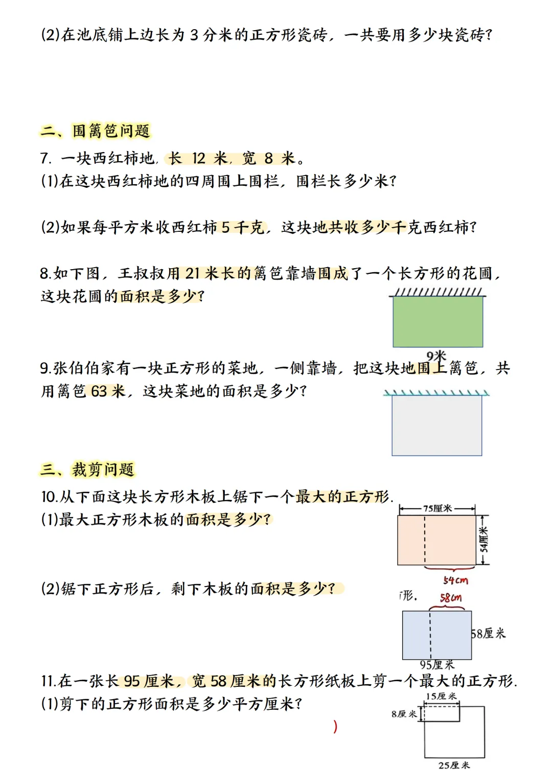 【免费下载】三年级(下)数学 面积专项应用题十种类型专项题,PDF电子版,共7页,先保存,以免资源失效