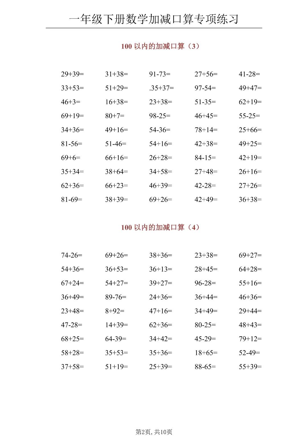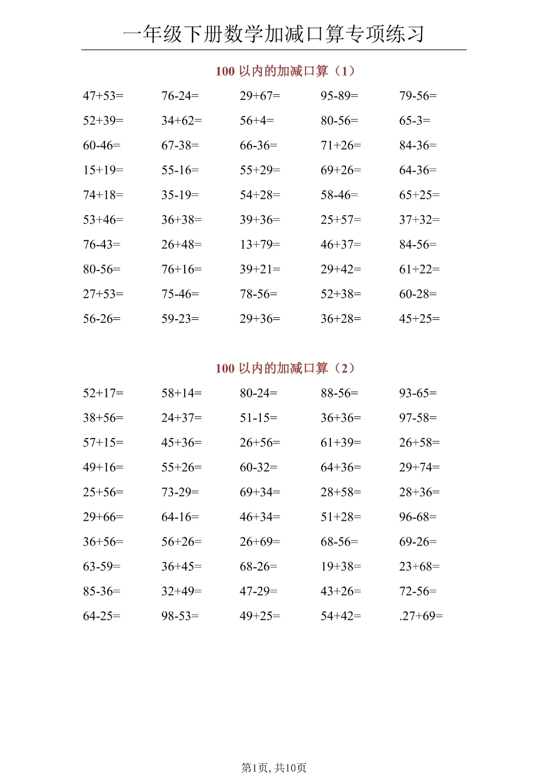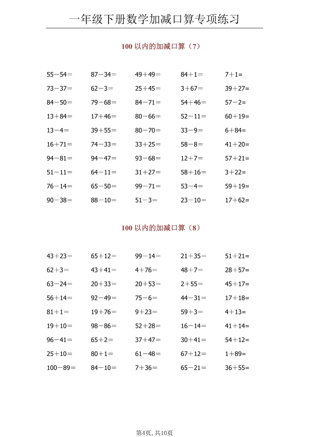 今日分享《一年级下册数学100以内加减口算》(共10页)电子版可打印。