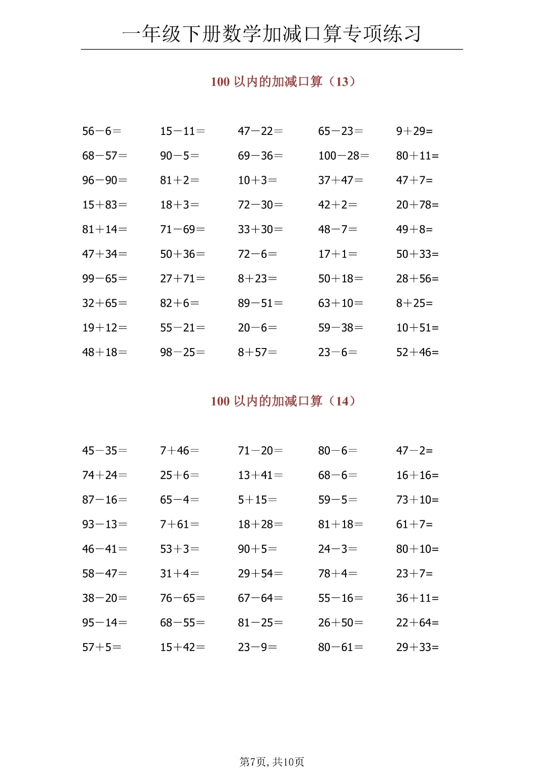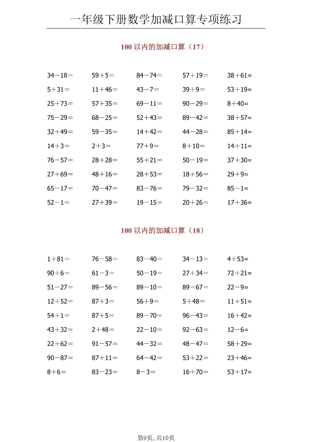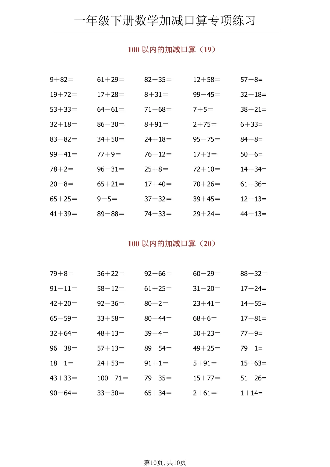 今日分享《一年级下册数学100以内加减口算》(共10页)电子版可打印。