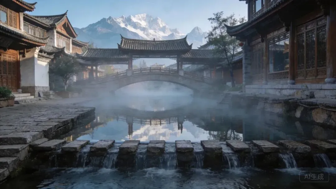 🏔️ 丽江古城 · 清晨薄雾与玉龙雪山倒影