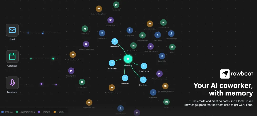作为一款本地优先的开源AI工作助手,Rowboat的核心能力是打通你工作中的各类数据入口,包括电子邮件、日历事件、会议记录等,在本地自动分析这些非结构化信息,将其梳理成结构化的知识图谱。