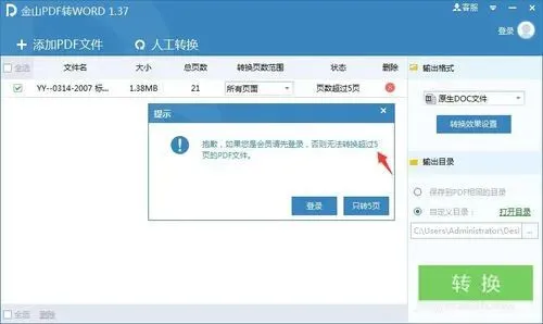 该软件对非WPS VIP有限制,未登录或非会员仅能转换前5页,页数范围功能仅限VIP使用;另外软件仅能原样转换文字与图片,无法识别图片中的文字内容。