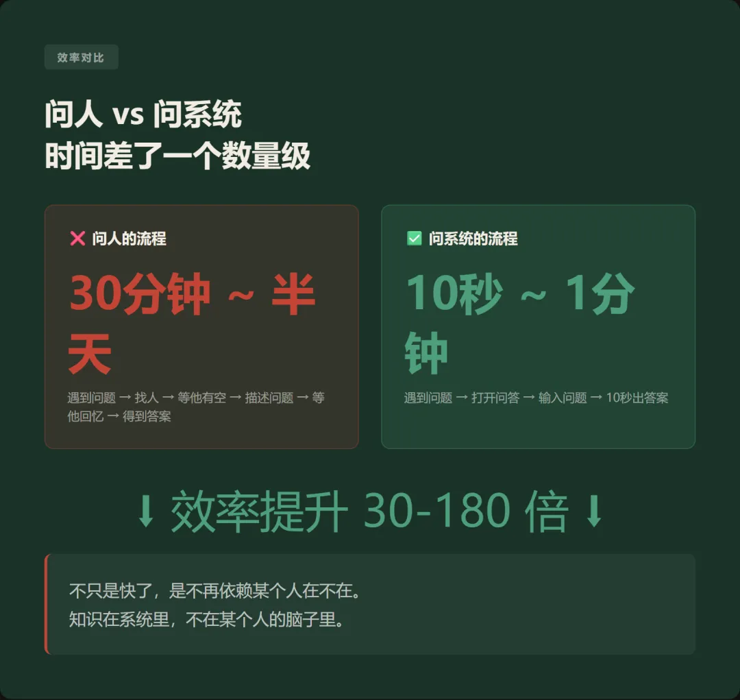你让工程师把这个写进文档,他得组织语言、理清逻辑、找到合适的位置放进去。这个工作量比写代码还大,写完了也没人看,因为后来的人不知道这条知识在哪篇文档的哪个角落。