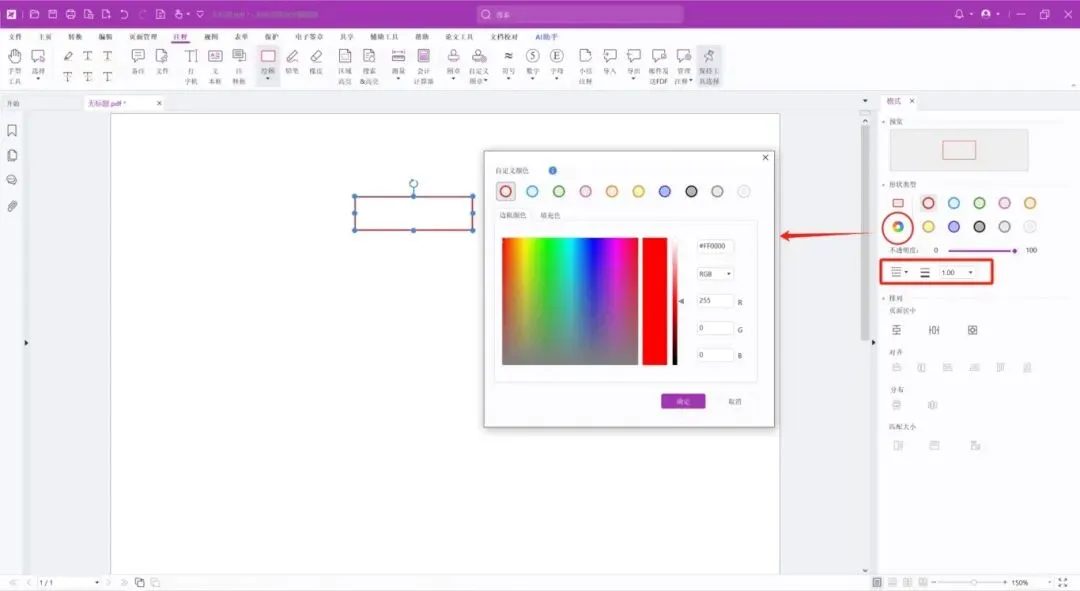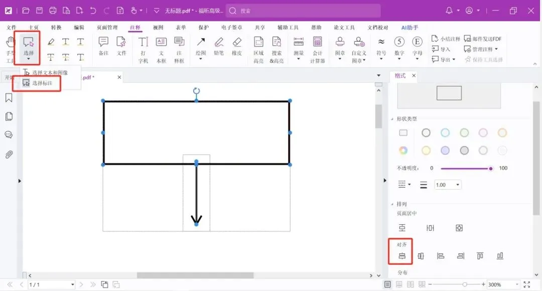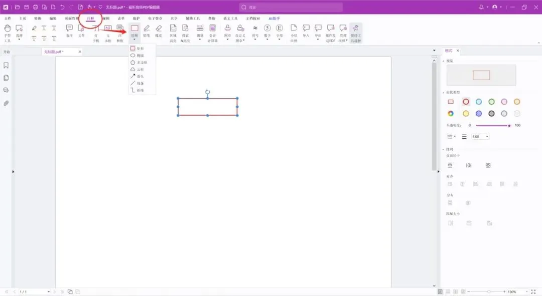 我们打开福昕高级PDF编辑器,新建一个文档,点击“注释”>“绘图”,选择矩形,绘制一个矩形框。