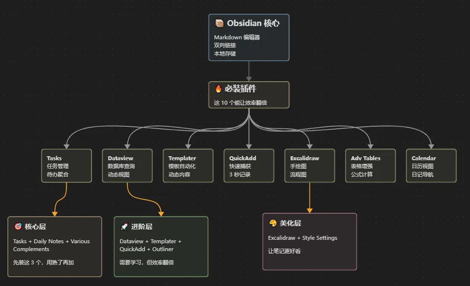 这 10 个插件是我精挑细选的,建议先装 3 个核心的(Tasks、Daily Notes、Various Complements),用熟了再慢慢加。