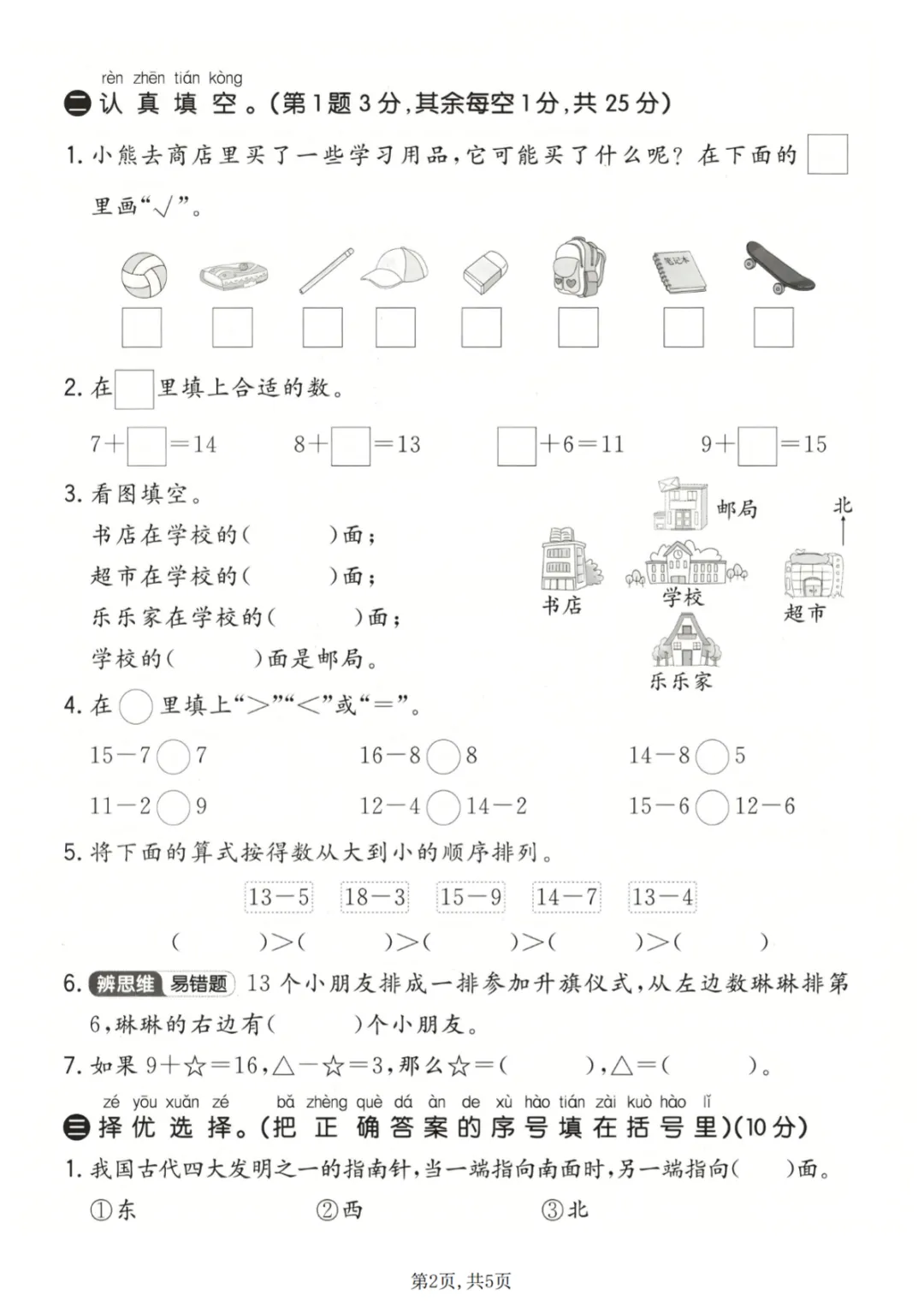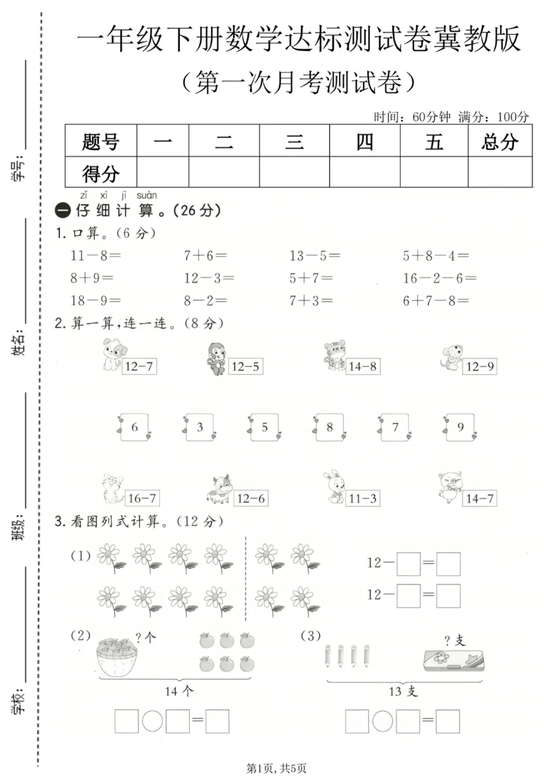 【免费下载】一年级(下)数学 第一次月考达标测试卷《冀教版》,PDF电子版,共5页,先保存,以免资源失效