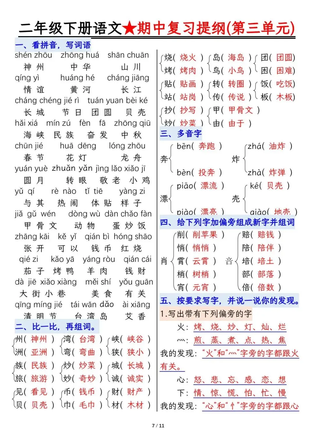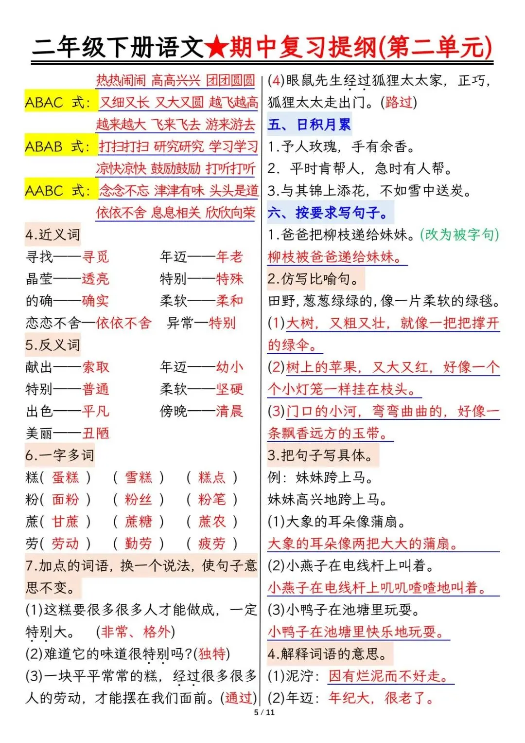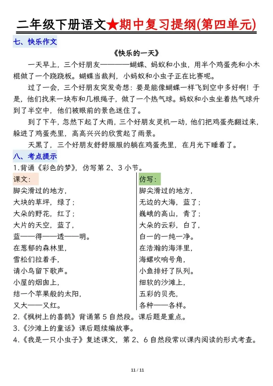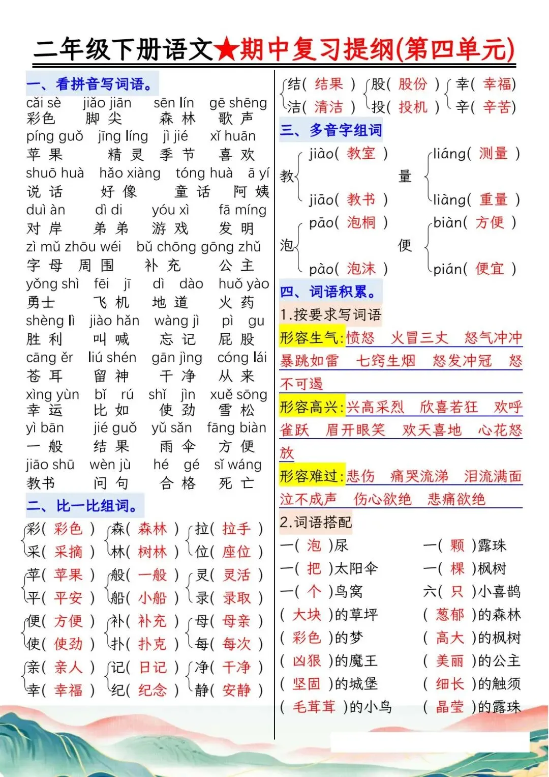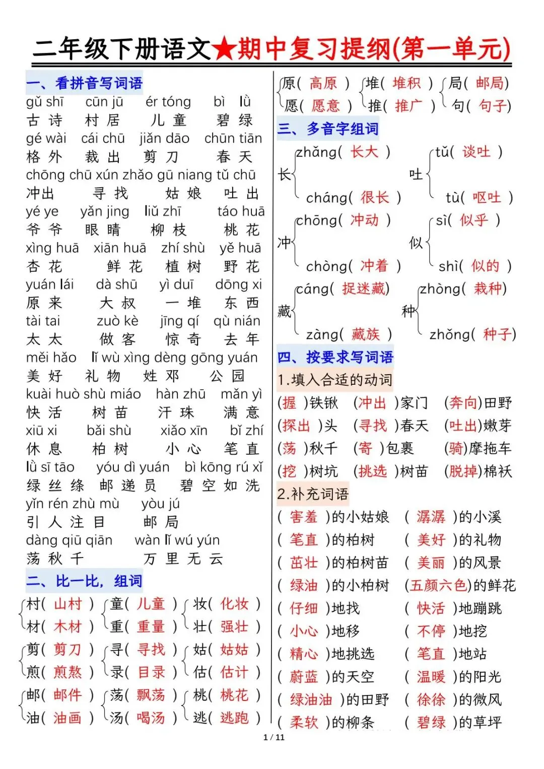 26年新版二年级下册语文《期中复习提纲》1-4单元,共11页,电子版可下载可打印。这份期中复习提纲把1-4单元的重点全拎出来了:看拼音写词语帮孩子记生字,比一比组词能分清形近字,多音字组词避免读错,按要求写词语积累词汇,仿写句子练表达,补充课文加深背诵。每天练一练,基础打得牢,考试不丢分。
