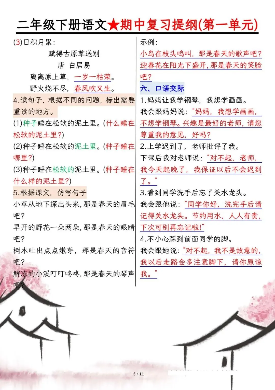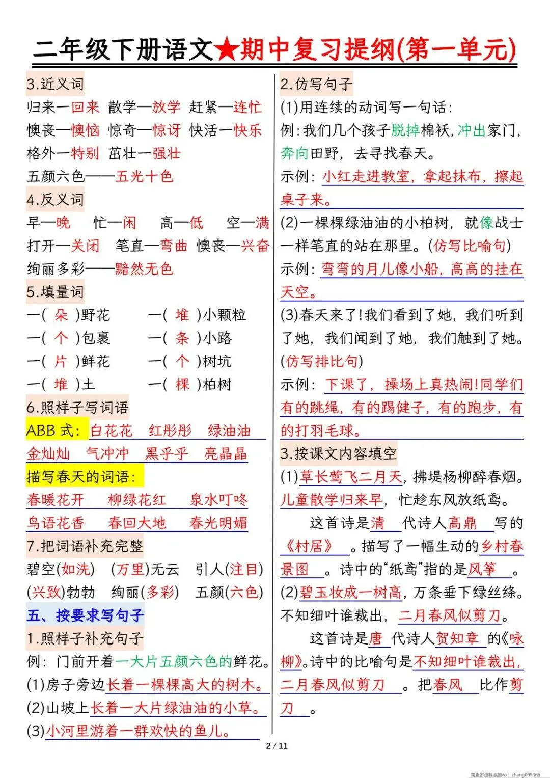 二年级期中冲刺必备!26版语文1-4单元复习提纲,电子版直接下载打印