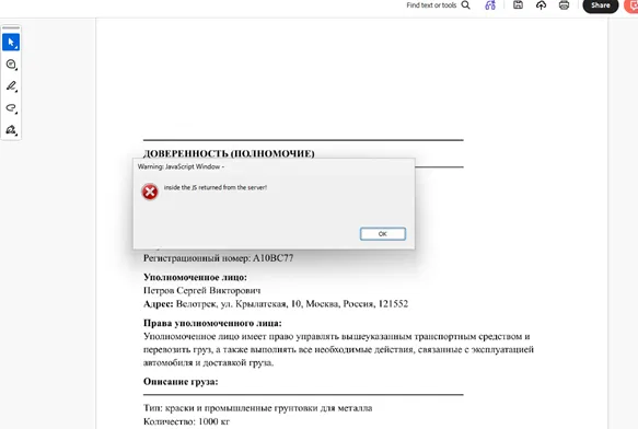 尽管最初的漏洞被证实对最新版本的Adobe Reader(26.00121367)有效,研究人员在测试过程中未能检索到疑似的次级有效载荷。然而,受控实验表明该基础设施可以提供额外的JavaScript,可用于实现远程代码执行(RCE)或沙箱逃逸(SBX)。在一次测试中,一个自定义服务器响应成功在Adobe Reader中执行了任意JavaScript,验证了攻击链的潜力。