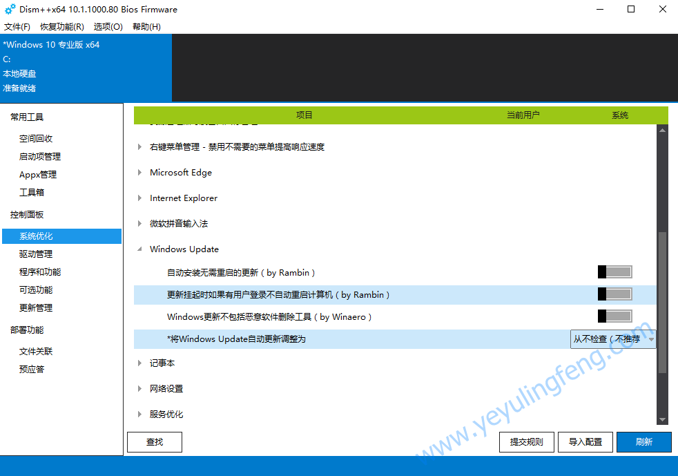 手动禁止Windows10禁止更新操作比较麻烦步骤较多,对于一些电脑小白萌妹啊就更糊涂了,为此老夜今个为大家分享一款一键操作的敲级简单且实用的免安装绿色电脑系统优化工具,一口气说的有点长也懒得加标点符号了~( ̄▽ ̄)~*今天的主角就是之前站内分享过的Dism++,因为上文中老夜马虎没有提及到该工具能win10禁止更新功能,导致大家一时半会想不到他的存在,功能太多也是错,长得太帅也是祸,作为一名靓仔老夜也感到很孤独~~~