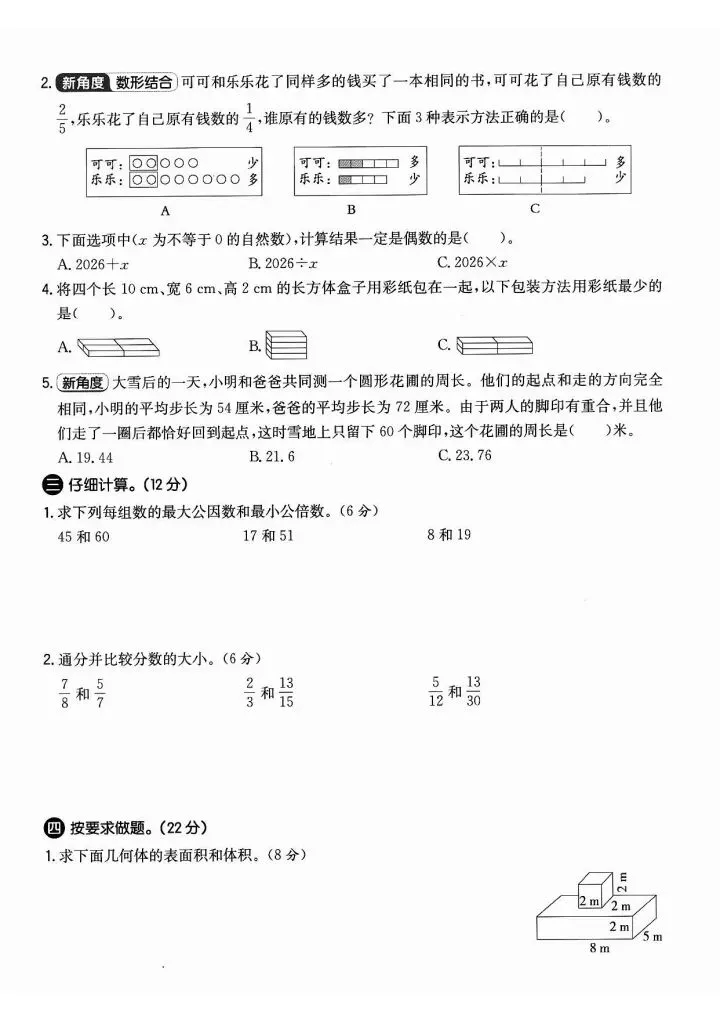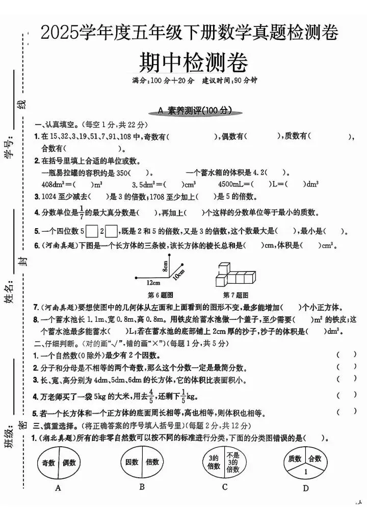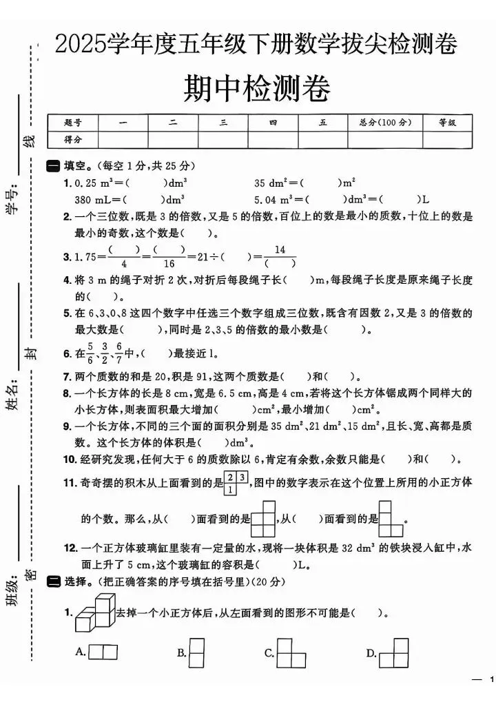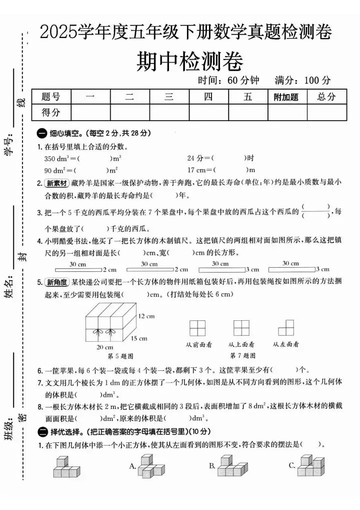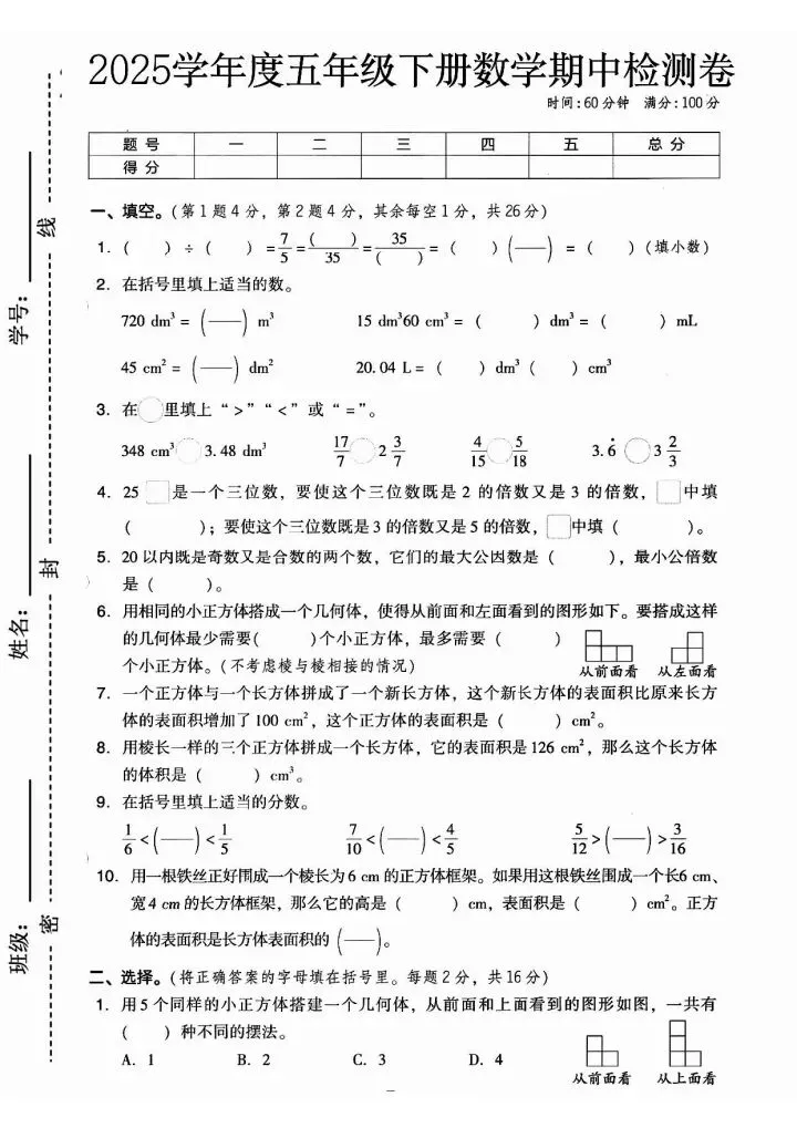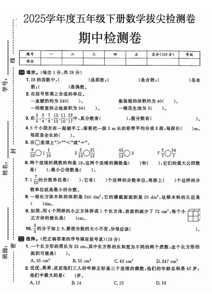 今日份分享五年级下册数学期中测试卷5套(完整电子版可打印)!这份资料已经整理成可打印版本,方便孩子随时翻看学习,建议家长先收藏,再转发给身边有需要的家庭,一起帮助孩子高效学习~